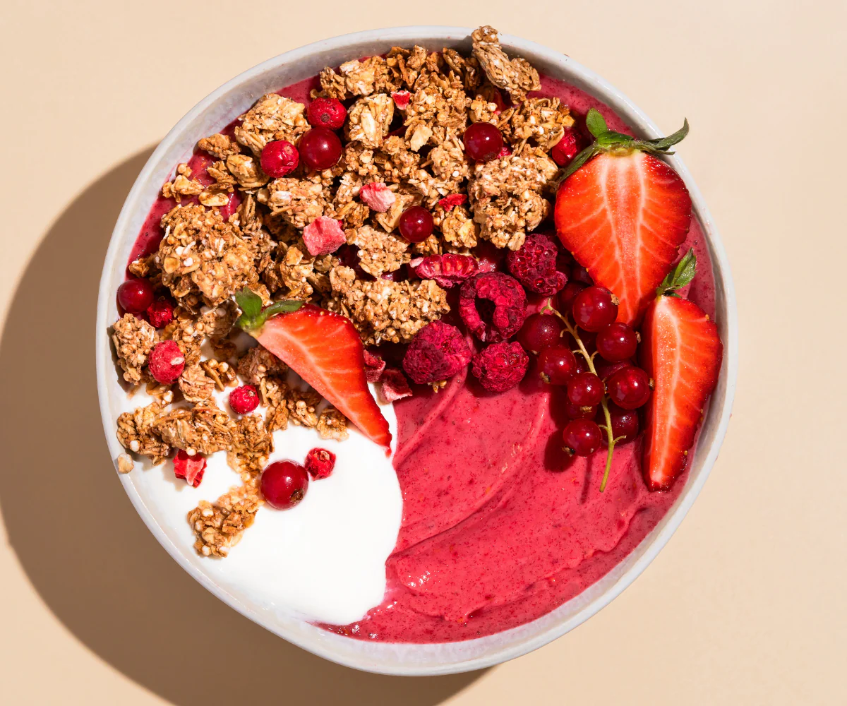 - Knuspriges Granola aus Vollkorn-Haferflocken mit gefriergetrockneten Erdbeeren & roten Johannisbeeren, Quinoa und Amaranth