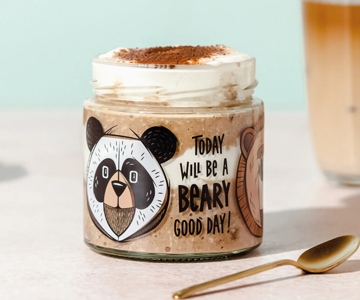 - Overnight Oats Mischung aus Haferflocken, Kaffee-Extrakt, Kakaopulver, fruchtigen Aprikosen- und Dattelstückchen